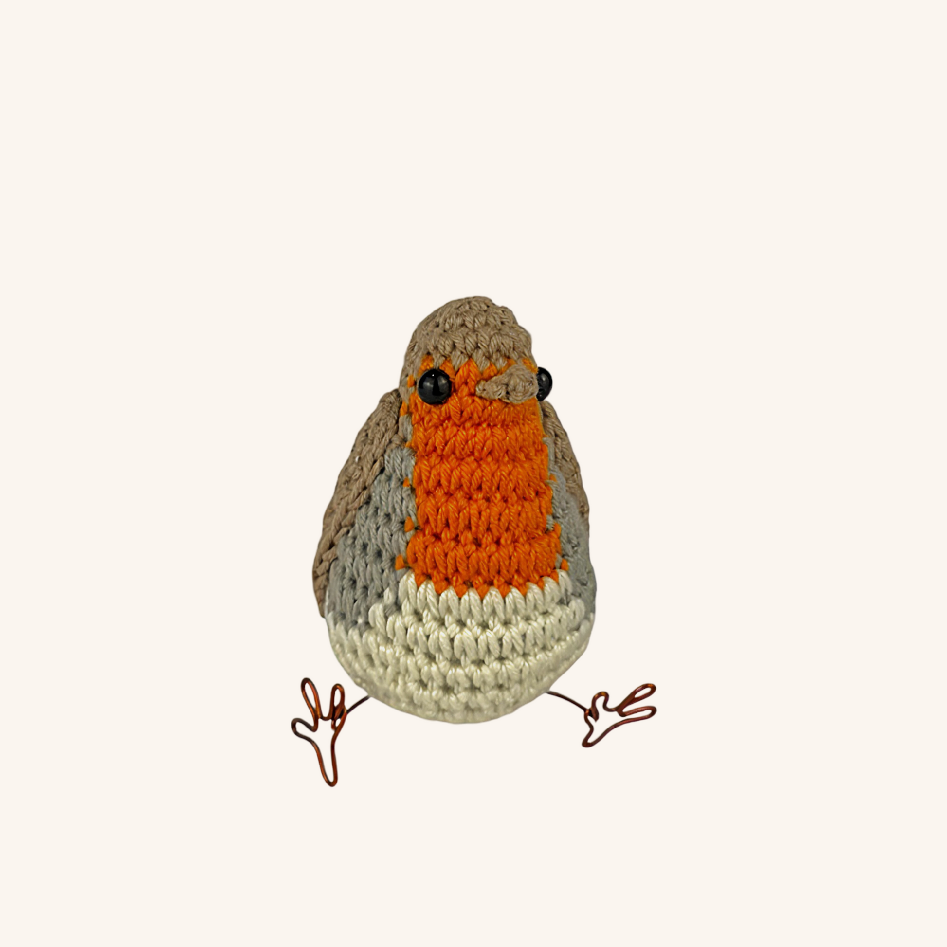 This hand-crocheted robin bird features a charming plump shape, wire feet, and safety eyes — perfect for shelf decor or as a cute handmade gift.